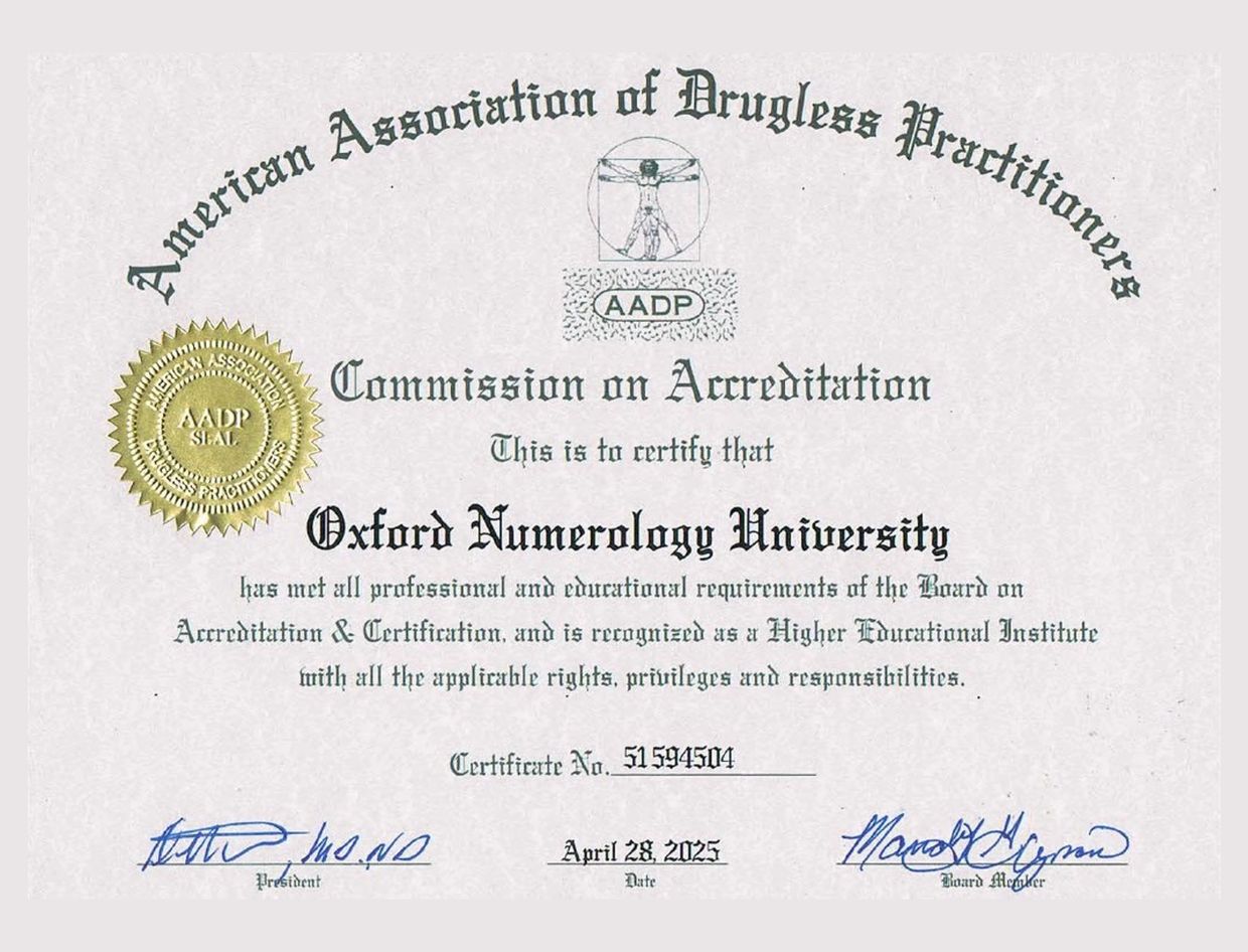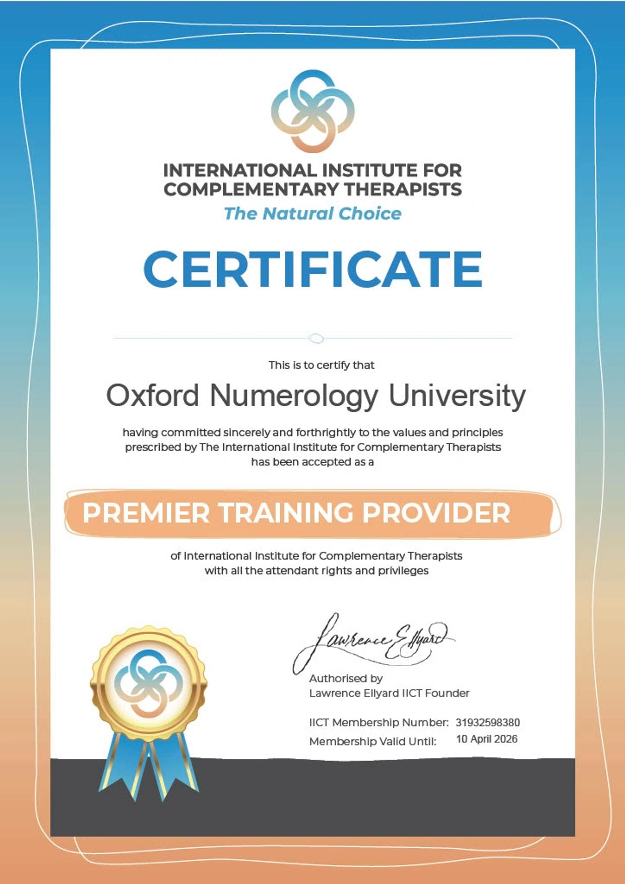 All students, graduates, and faculty members of Oxford Numerology University® are covered by a comprehensive professional liability insurance policy with a coverage limit of £5,000,000 (GBP). This policy ensures full protection during all training, consultancy, and evaluation activities carried out under the academic and professional authority of the Oxford Numerology University®. We believe that credibility and responsibility are essential in the practice of numerology. Our commitment to international safety standards, ethics, and transparency is reflected in this institutional insurance protection, valid across all accredited countries and territories.