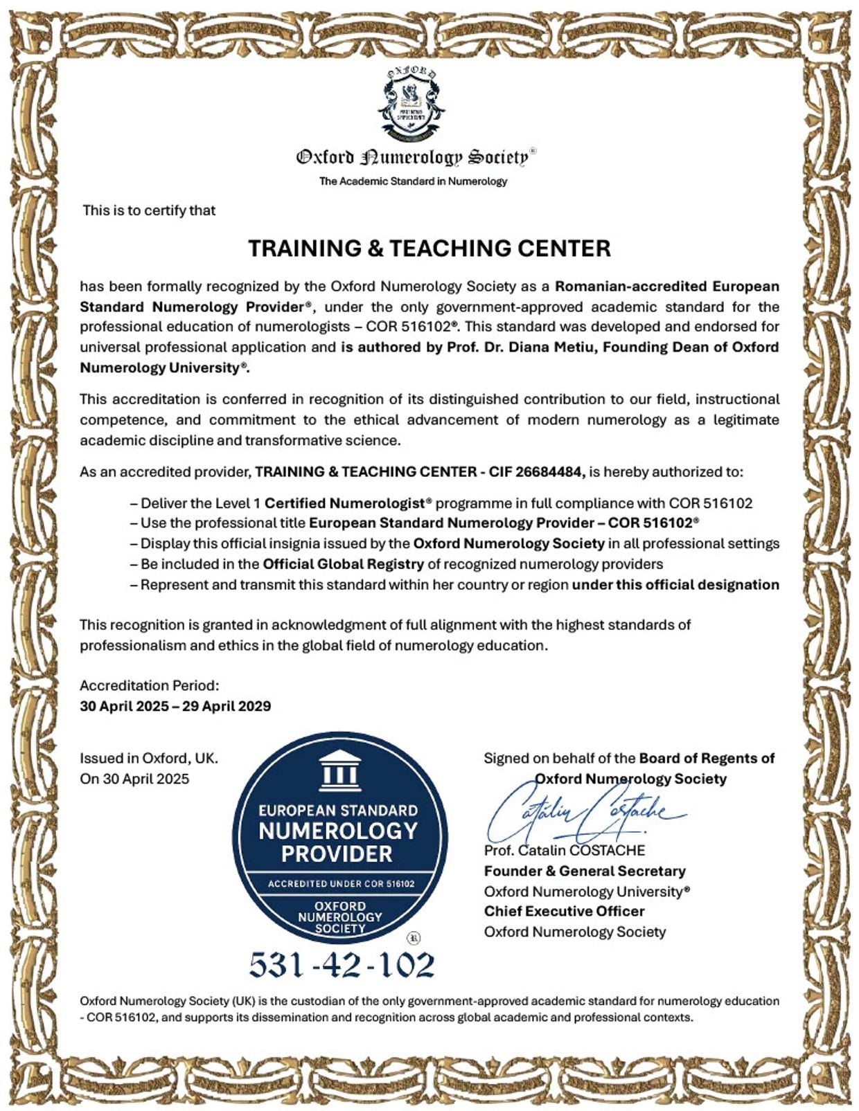 © 2004–2025 Oxford Numerology University® — este recunoscută și apreciată de sute de numerologi profesioniști din întreaga lume, care și-au finalizat studiile în cadrul instituției noastre.